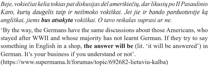 Žeimantienė, Vaiva. 2005. Einzelsprachliche Realisierungen des Subjekt-Impersonals: Das Beispiel deutscher man-Sätze und ihrer Entsprechungen im Litauischen. Kalbotyra 55 (3), 81–90.