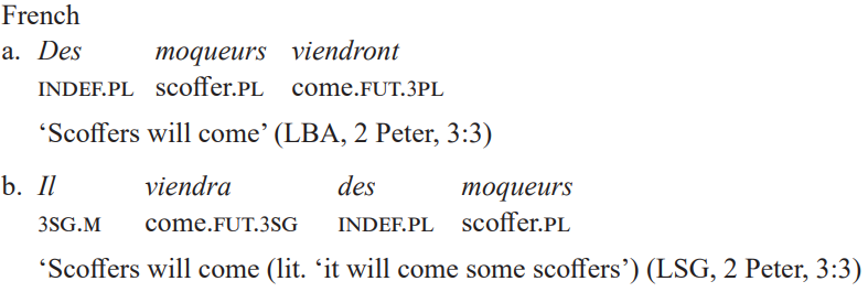 Malchukov & Ogawa (2011) classify impersonal constructions into three types: A-impersonals, T-impersonals and R-impersonals. A-impersonals are sensitive to reductions in the animacy/agentivity of the subject. In 4a. above, for instance, the experiencer is coded as an oblique (dative) instead of being coded as a nominative subject, because it is not agentive. T-impersonals are sensitive to a reduction in topicality: in the French sentence in (5a) the participant moqueurs ‘scoffers’ is the grammatical subject and the topic; in (5b), the role of grammatical subject is taken over by the dummy il ‘it’, while the participant moqueurs ‘scoffers’ is in focus and stripped off agreement control (cf. Malchukov & Ogawa 2011, 30).