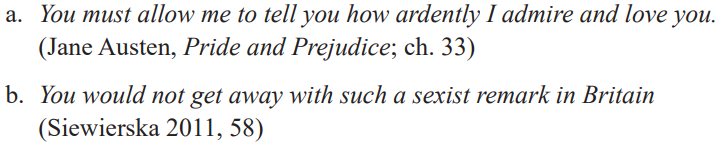 Finally, R-impersonals are sensitive to reduction in referentiality: in (6a.) Mr. Darcy, a character from Jane Austen’s Pride and Prejudice, declares his love to Elizabeth Bennet, the protagonist of the novel, referred to in the text by the deictic you. In (6b.), instead, you has a non-referential, generic interpretation (‘anyone who would utter such a remark in Britain would not get away with it’):