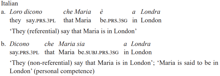 In typological literature, different kinds of constructions have been subsumed under the label ‘impersonal’ (cf. Siewierska 2008): constructions lacking a syntactic and referential subject, such as meteorological verbs; constructions with a dummy, non-referential subject such as es ‘it’ in German; constructions lacking a grammatical but not a semantic subject, such as dative experiencer constructions in many Indo-European languages; and, finally, constructions featuring non-referential grammatical subjects, such as the man-construction in German and the ‘vague they’ construction in English. In this paper, I follow the definition of impersonal constructions adopted in Siewierska (2008) and Malchukov & Ogawa (2011, 20) as “constructions lacking a referential subject”. This definition is broad enough to subsume both constructions that qualify as impersonal from a syntactic point of view (lack of agreeing subject altogether; cf. example 4a) and from a functional point of view (lack of referential subject; cf. examples 4b and 4c, where they and it are non-referential):