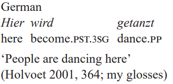 Participial-imp are not as common in Europe as the two other strategies. They are found in Germanic, Baltic, Slavic and Finnic (Siewierska 2008, 21): notable examples are the German passive impersonal (11a, 11b), the Polish no/to construction (13) and the Lithuanian ma/ta constructions (see Sections 2 and 3). In European languages, participial impersonals feature a form identical with or derived from a participle, usually past passive: therefore, they share morphology with passives, cf. the following German examples (11a and 11b).