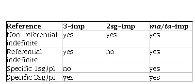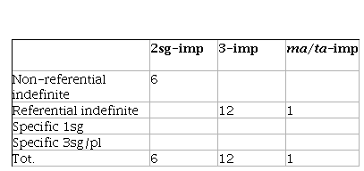 My analysis confirms the results of previous studies: 3-imp have their semantic referential nucleus in the expression of referential indefinite agent, 2sg-imp are confined to the expression of generic and specific agents and ma/ta-imp are able to code all types of reference.