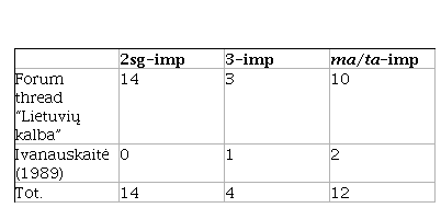 As for their distribution, ma/ta-imp and 2sg-imp are by far more frequent than 3-imp. Siewierska (2011) puts Lithuanian in the group of languages that “virtually lack 3(pl)- imp”: while it is true that this strategy is the least frequent, it is nevertheless present even in my small sample, in all four sources (in the translation of Harry Potter, 3-imp are more frequent than in the original Lithuanian texts, probably due to the influence of the original text). 2sg are more frequent in stylistically informal texts – it is by far the predominant strategy in the forum texts, while it is completely absent in the more formal language of Ivanauskaitė’s short story. Ma/ta-imp are stylistically neutral, and they are found in both original Lithuanian sources.