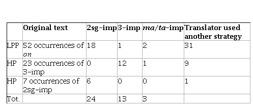These sources are extremely different from each other: LPP and HP are translations, where the influence of the original may have led to linguistic choices that would have been different in an original text. I have chosen to examine them because they offer an easy way to find impersonal constructions in their Lithuanian translations. I have checked translation equivalents of French on-imp, English 3-imp (impersonal they) and 2sg-imp (impersonal you). French on has a very wide referential range (species generic, non-referential indefinite, referential indefinite, specific): therefore, different Lithuanian translation equivalents may be determined by different referential semantics, blended out in the original4; conveniently, on has no direct equivalent in Lithuanian, and therefore there is no risk of the original form being directly calqued into the translation. As for the English 3-imp, I have not considered instances where they anaphorically refers to an antecedent such as anybody or somebody, or to a noun referring to a person of indefinite gender (such as teacher).