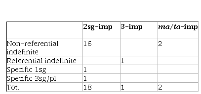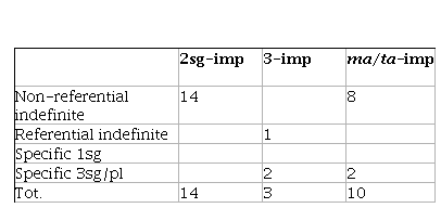 3.2 Referential properties of 2sg-imp, 3-imp and ma/ta-imp