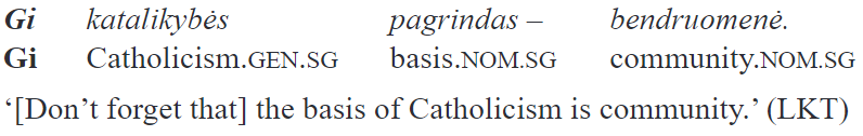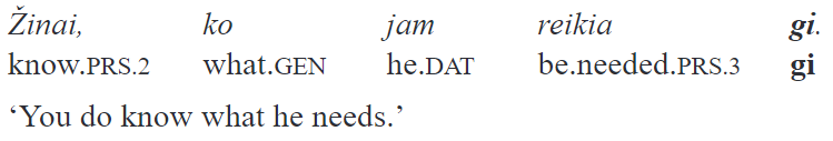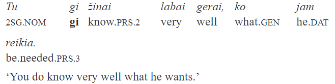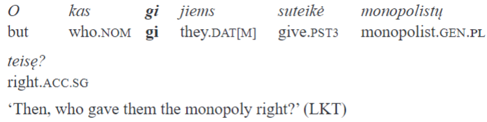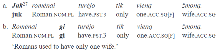 The elements we focus on in this paper are classified as “intensifying-emphatic particles” in Ambrazas (1997, 401–402). Besides juk and gi, the connecting element ir is also included in this group. All three “emphasize a word or a clause”. In my view, there are at least two problems with this definition. First, it is not made explicit what is understood under “emphasis”: this notion seems far too vague and permits a large range of interpretations. Second, modifying a “word” or a “clause” are two very different things in terms of semantic scope. In fact, in the examples of gi in which it is claimed to intensify a single word, the particle’s scope is the whole sentence (“The particle gi, usually postposed to the word it intensifies, sometimes occurs in the initial position” [Ambrazas 1997, 402]):