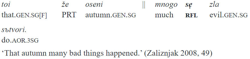 Other cases when gi is seemingly found in a position other than the second one may be described using the insights gained in Andrej Zaliznjak’s works on the second-position clitics in Old Russian. As Zaliznjak demonstrates (2008, 47–56), Old Russian clitics are able to “move” rightward from the second position in the cases when obligatorily sentence-beginning elements such as conjunctions or fronted constituent(s) (i.e. a topicalized or a focalized phrase) are present. In such cases, a “barrier” (Rus. ritmikosintaksičeskij barjer) is placed after these elements, and the second position is counted starting from the barrier, e.g.