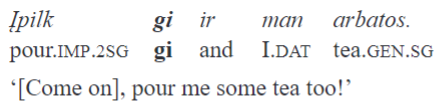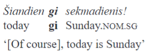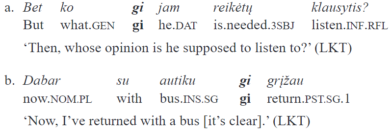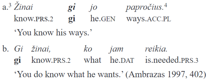 Etymologically, gi derived from either the *g- or the *gh- particle of Proto-Indo-European, possibly from both particles which merged phonetically. The original meanings of *g- or*gh- remain relatively obscure, and Common Slavic *že, and both Greek de and ge are possible cognates (Dunkel 2014, 279–282). However, it is unclear how exactly gi came to function the way it does in contemporary Lithuanian, and more research is needed. It is clear that the particles of Lithuanian and German grammaticalized from different sources in different periods. More areal-typological as well as historical data is required to understand how different developments led to similar results in the two languages discussed in this paper.