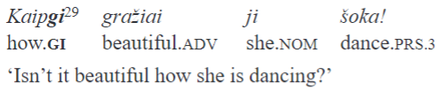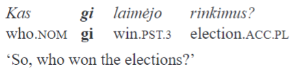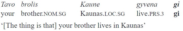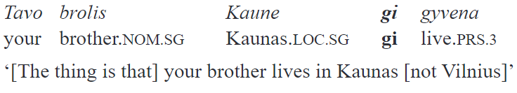 Finally, in colloquial language gi is able to occur after a focused constituent preserving its sentence scope. In the following example, Kaune ‘in Kaunas’ is said with an intonation which marks the sentence focus: