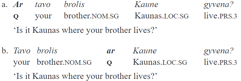 In both sentences, Kaunas is focalized. This is marked by the focus intonation with which Kaune is pronounced. The sentence turns unacceptable if one preserves the focus intonation on Kaune but moves ar to another constituent, e.g., before gyvena ‘lives’. Such a movement is only possible if gyvena becomes focalized, and this should be reflected in an intonation change (the focus intonation moves to gyvena)15.