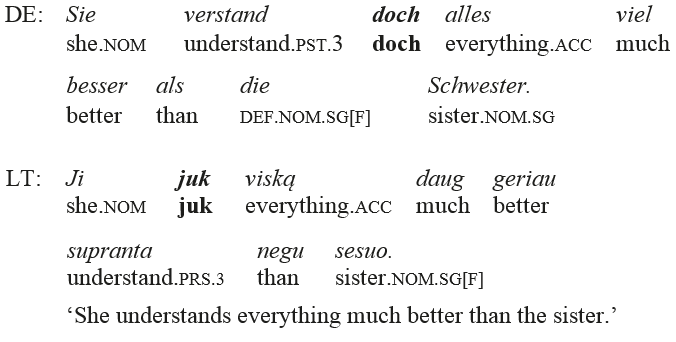 Concerning the positions in sentence of juk and gi, on the one hand, and doch and ja, on the other hand, these are defined on the basis of language-specific rules in both German and Lithuanian. These rules are different, and the German particles are characterized by stricter positioning (in the “middle field”).