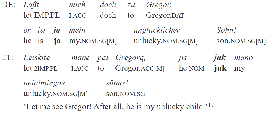 A reason for comparing elements of different languages is the ability of these elements to translate each other. In the absence of an accessible German-Lithuanian parallel corpus, such a work cannot yet be done systematically.16 However, a preliminary study of existing bilingual texts shows that both gi and juk often correspond to both doch and ja in translations, cf. a fragment of the Lithuanian translation of Kafka’s Die Verwandlung (15 - 16):
