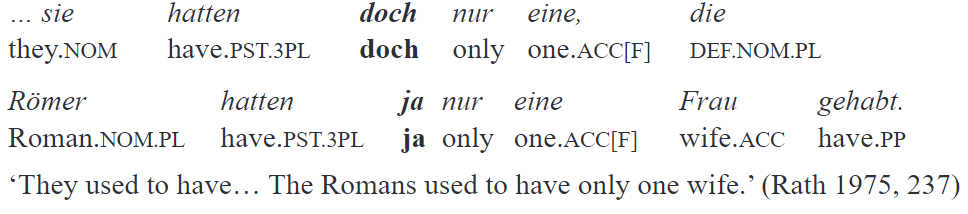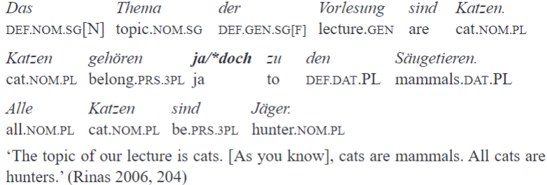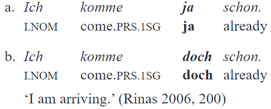 From the very beginning, scholars noticed the functional affinity between ja and doch21. In fact, in many contexts they are interchangeable without a significant loss in sense. Consider an example in which the speaker starts a sentence with one particle, and then substitutes it with another after a pause in a self-repetition: