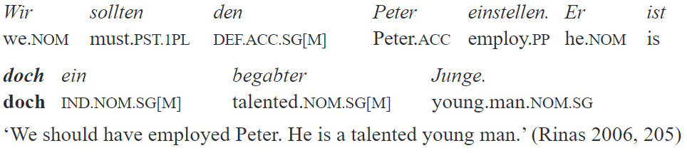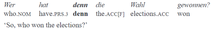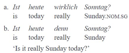 German (as well as other West and North Germanic languages with the exception of English) exhibits a morphosyntactic class of elements which manifests properties similar to those I define as sentence particles in Lithuanian. In the German descriptive tradition, such elements are called Abtönungspartikeln (‘nuance particles’) or Modalpartikeln, and the labels modal particles or discourse particles are used in English-language publications. Modal particles constitute a clear-cut word class in German and some other West and North Germanic languages.18 These are characterized by two main morphosyntactic properties: