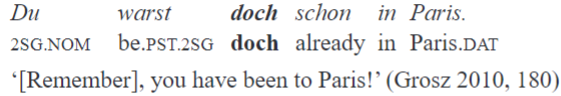 In (18), the speaker believes that the hearer knew but forgot Peter’s virtues or even has an opposite opinion about him; the fact of Peter’s being suitable for the job position is beyond doubt for the speaker her/himself. Therefore, less strong formulations are needed, e.g. as the following one: “[the] feature that ja and doch have in common is that in both cases the proposition expressed – say, P – is taken for granted by the speaker, and is assumed to be taken for granted by the hearer as well” (Gast 2008, 187). A good label that captures this is the notion of uncontroversiality, more precisely, framing23 the proposition as uncontroversial. This term is used to some extent by Rinas (2006), and it is crucial in Grosz (2010).