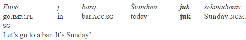 In this study, I investigated the elements of contemporary Lithuanian known as “particles” in traditional descriptions. I demonstrated that elements labelled in this way actually exhibit very diverse morphological and syntactic properties. This particularly concerns the issues of boundness and scope relations. Lithuanian “particles” can take scope over a single word, a phrase, or a sentence/utterance. I suggested labelling the latter type sentence particles. I then focused on a case study, namely two sentence particles – juk and gi – which, as I argue, belong to this category, and whose functions had not been properly investigated. Invoking some influential descriptions of German particles ja and doch, I argued that juk and gi can be analyzed in the same terms, namely, as markers whose core function is framing the proposition under scope as uncontroversial. More than that, juk and ja, on the one hand, and gi and doch, on the other, exhibit subtler functional parallels in that the latter two occur in contrastive contexts, wh-questions, wh-exclamatives, and commands, whereas the former are restricted to statements and do not imply a contrast.