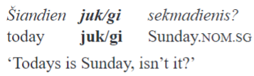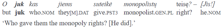 The etymology of juk is indicated as obscure by Smoczyński (2017, 453). Ostrowski (2015) suggests deriving it from the combination of juo ‘especially, notably, all the more’ and kai ‘when’. The path of development of the particle gi is even more obscure. In Old Lithuanian, the particle clearly had a phrasal, not sentential scope, probably marking some kind of focus as in the Postilė by Bretkūnas:35