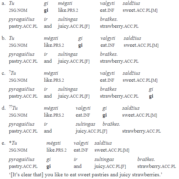 Ex. (2a) is the most natural and strictly preferred in contemporary Lithuanian, (2b) and (2c) are reported possible in spontaneous speech (2b is better than 2c), (2d) is highly unlikely (possible only in a self-correction), and (2e), in which gi follows the first direct object, is impossible. In (2c) gi, although it follows the second direct object, this constituent is not focused: it is still the whole sentence that the particle takes scope over, as in (2a) and (2b). One can conclude that the scope of gi is the hole sentence regardless of its position,5 which is most often the second one (“Wackernagel”), but sometimes also the sentence-initial (1b), the postverbal (2b), or the sentence-final one (2c).6