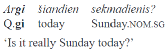 The combination of the polar question particle ar and gi (spelled as a single word argi) mark polar questions in cases when the speaker has doubts about the truth of the proposition under the scope of the question marker: