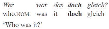 Moreover, unlike gi, the German doch occurs in wh-questions only marginally. The most typical occurrence of doch in wh-questions in German are the situations in which the speaker forgot something and wants the hearer to help recover the knowledge. It often co-occurs with another particle gleich: