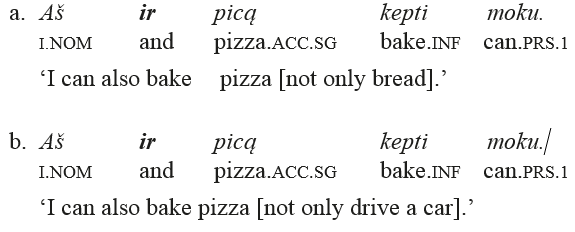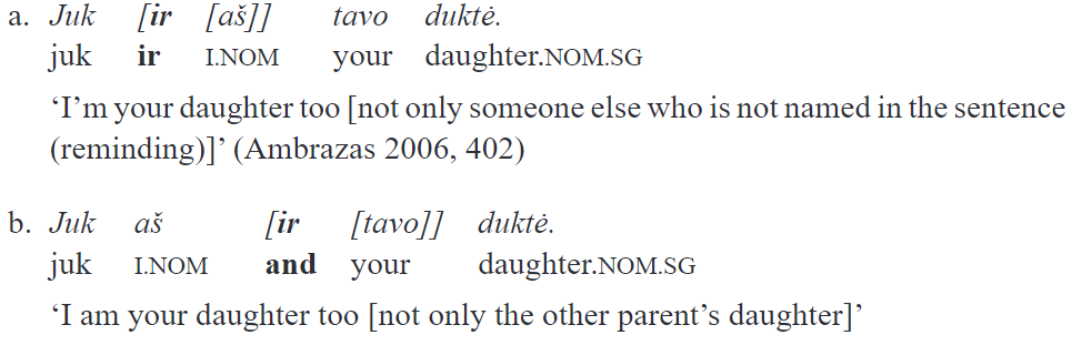Unlike gi and juk, the elements such as ir ‘also’ and net ‘even’ (included in the same “intensifying-emphatic” category in Ambrazas, 2006) exhibit a different scope-related behavior. For instance, the example with ir taken from the grammar can be modified in the way shown in (5):