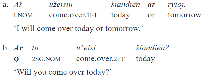 I will now focus on the morphosyntax and functioning of two elements of contemporary urban spoken Lithuanian – juk and gi. Both elements fall into the type “sentence particles” if the proposed criteria are applied. Both take scope over the whole sentence, both cannot occur in isolation (are bound), both have preferred, although different, positions in their host sentences. Another and probably the single other element of Lithuanian which shares the same set of morphosyntactic properties is the polar question marker ar (7b), unlike its cognate and diachronic source ar which is a marker of alternative (7a):