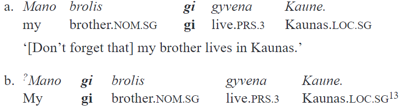 Similar forces seem to be involved in Lithuanian. Gi also “moves” rightward in the sentence if some specific kind of element occurs in the beginning of a sentence. It may be a conjunction or a sentence-initial discourse marker as in (11a), or a fronted topicalized or focalized constituent, e.g., an adverbial as in (11b):