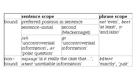 Additionally, modal particles are typically unstressed and integrated into the sentence intonation. Another non-trivial and typologically non-obvious characteristic of the Germanic modal particles is the “form – function” correlation. Indeed, modal particles that are found in the middle field tend to express the attitude of the speaker toward the proposition (Bross 2012, 185), whereas “connectives” or “conjunctions” whose functional domain is relating the proposition to the previous discourse unit usually occur sentence-initially (but there are exceptions). All these properties resemble those of the Lithuanian sentence particles, the main difference being the strictness of the position in a sentence (rigid in Germanic, more loose in Lithuanian).20