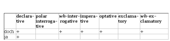 Another important aspect in which doch and ja exhibit differences is their ability to occur in various types of speech acts. In this respect, ja turns out to be more restricted and only occurs in declaratives, see Table 2: