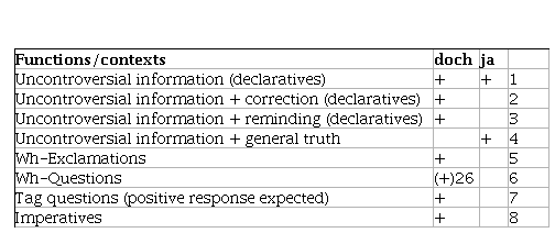 On the basis of the analyses by Thurmair (1989), Karagjosova (2004), Rinas (2006), Gast (2008), and Grosz (2010), in Table 3 I provide a summary of the main contexts in which doch and ja occur (“functions”)25. This is not exhaustive, but covers the most recurrent uses: