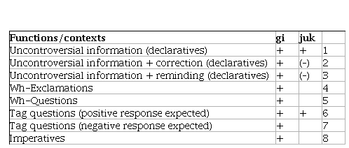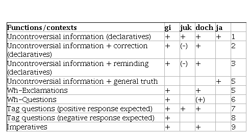 To summarize, all the four particles of both languages exhibit a common functional core. Roughly speaking, the functional scale of doch is very much like the one of gi, whereas ja exhibits similarities with juk. In both cases, the coincidence is not complete, but there are more similarities than differences. It is also to be noted that the distribution of juk and gi in Lithuanian is freer than that of doch and ja: the Lithuanian particles are interchangeable in more contexts.