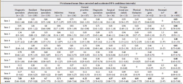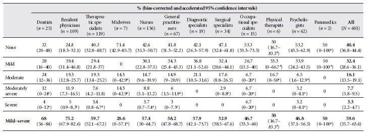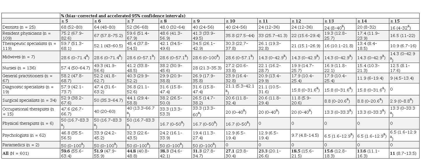 Screening results for depression for the cut-offs of ≥ 5–15 on the PHQ-9 as revealed by the summed-item score method are presented in Appendix 5. For the cut-off of ≥ 10, the dentists, resident physicians, and therapeutic specialists had the highest screen-positive rates, whereas the psychologists reported the lowest. The overall rate for the threshold of ≥ 10 was 27.1% (BCa 95% CI, 23.8, 30.4).