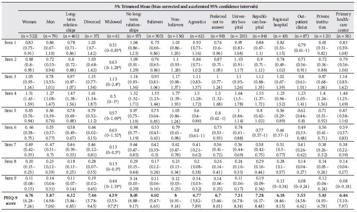 Appendix 2. 5% trimmed mean scores of the key symptoms for a major depressive disorder as assessed by the Patient Health Questionnaire-9 (Items 1–9), by grouping variables (gender, marital status, religious beliefs, and main workplace).