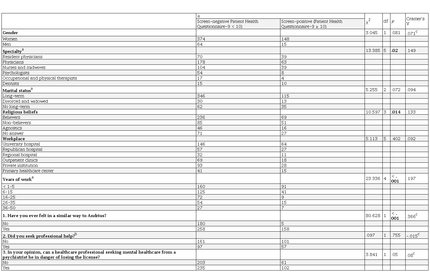 Rezultatai: Dauguma respondentų nurodė bent kartą gyvenime patyrę į depresiją panašių simptomų. Maždaug trečdalis iš jų siekė profesionalios pagalbos, iš kurių apie pusę kreipėsi į privačiai dirbantį specialistą. Siekti pagalbos dažniausiai kliudė stigma ir abejingumas savo psichikos sveikatai. Maždaug pusė tyrimo dalyvių nurodė manantys, kad dėl kreipimosi į psichiatrą gali iškilti grėsmė netekti sveikatos priežiūros licencijos. Remiantis gautomis PHQ-9 vertėmis, maždaug ketvirtadaliui tyrime dalyvavusių specialistų būtų galima įtarti esant kliniškai reikšmingų depresijos simptomų. Statistiškai reikšmingi PHQ-9 verčių skirtumai buvo aptikti tarp specialybės, šeiminės padėties, religinių įsitikinimų, darbovietės ir darbo sveikatos priežiūros įstaigoje laiko (metais) kategorijų. Trumpesnis darbo sveikatos priežiūros įstaigoje laikas ir jaunesnis amžius buvo susiję su didesne PHQ-9 verte