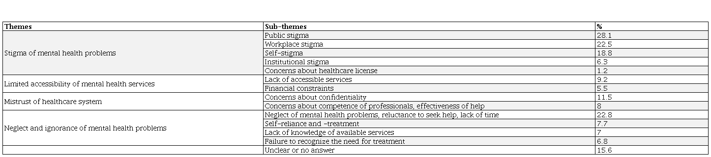 As HCPs are likely to experience healthcare services in a different way than other patients, there is a need for free, easy-access specialized programs aimed at providing support and treatment for the HCPs. It is important to ensure that such help is provided instantly and in a confidential and evidence-based manner. In this way, many barriers to help-seeking, including those that we found, i.e., stigma, limited accessibility, concerns about confidentiality and involvement of the regulating authorities, could be overcome. In this study, the public stigma (28.1%), workplace stigma (22.5%), self-stigma (18.8%), and neglect of mental health needs (22.8%) emerged as the main themes extracted from the qualitative data regarding barriers to mental health help-seeking.