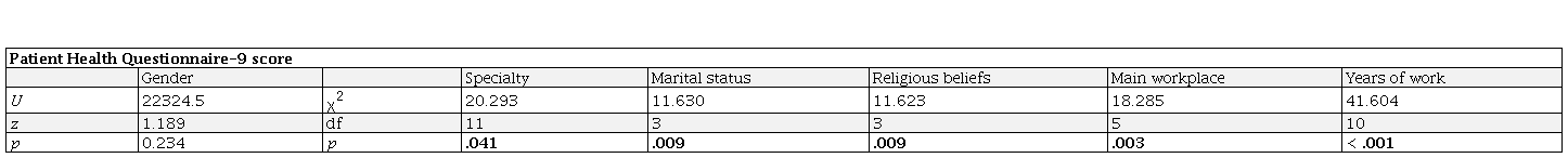 Responses for individual items of the PHQ-9 by socio-demographic variables and by specialty are shown in Appendix 2 and Appendix 3. There was a statistically significant and moderately strong association between the experience of depression-like symptoms over the lifetime and the screening results for depression, χ.(1) = 80.63, . < .001, Phi (.) = .366 (see also Appendix 4). Inferential statistical analyses showed that the PHQ-9 score differed statistically significantly between the categories of marital status, religious beliefs, main workplace, specialty, and years of work in the healthcare system (Table 3). Long-term relationships, identifying oneself as a believer, employment in a private institution or outpatient clinic, and working in the healthcare system for a longer time (21–30 years) were associated with significantly lower PHQ-9 scores in comparison to corresponding categories as shown in Table 4. The psychologists had a statistically significantly lower PHQ-9 score compared to the resident physicians (mean rank, 241.02 vs. 351.33; . = .04). Moreover, statistically significant, weak negative correlations between the PHQ-9 score and both the age of the respondents (.. = –.186; BCa 95% CI, –.245, –.127; . < .001) and years of work in the healthcare system (.. = –.186; BCa 95% CI, –.249, –.128; . < .001) were revealed.