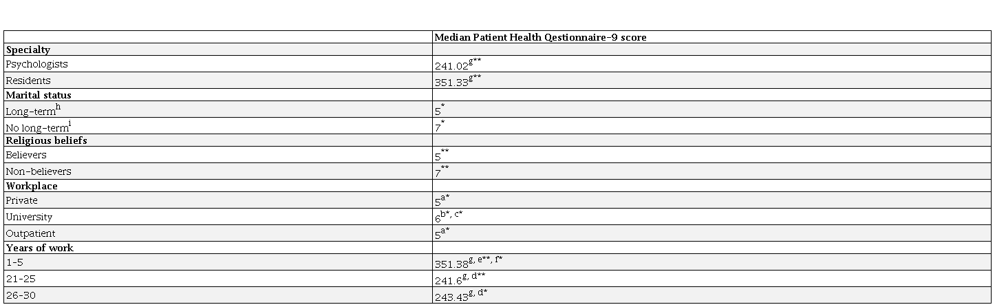 In a prospective cohort study of medical interns [21], the female gender was identified as a predictor of increased depressive symptoms. However, in our sample, we found no statistically significant differences between the PHQ-9 scores of women and men, though the latter group reported fewer depressive symptoms.