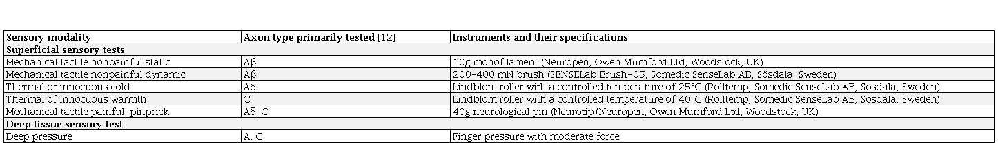 The full sensory testing battery consisted of 6 tests (5 superficial and 1 deep sensory perception), as listed in Table 2. All superficial sensory tests were performed using standardized instruments that are approved and manufactured for this purpose.
