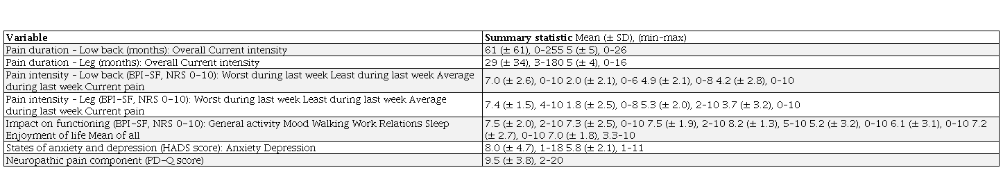 Pain evaluation consisted of: pain intensity evaluated separately for low back and leg (Brief Pain Inventory short form (BPI-SF) Pain items, numeric rating scale 0 to 10 points (NRS 0-10)), pain impact on functioning (BPI-SF Interference items, NRS 0-10), anxiety and depression evaluation (Hospital Anxiety and Depression Scale (HADS) score), screening for neuropathic pain component (painDETECT Questionnaire (PD-Q) score). Assessment of magnetic resonance imaging (MRI) and/or computed tomography (CT) of the lumbosacral spine not older than 6 months were collected and analyzed. Sensory testing was performed on all patients, collecting data on sensory disturbances, testing duration, and any test completion problems.