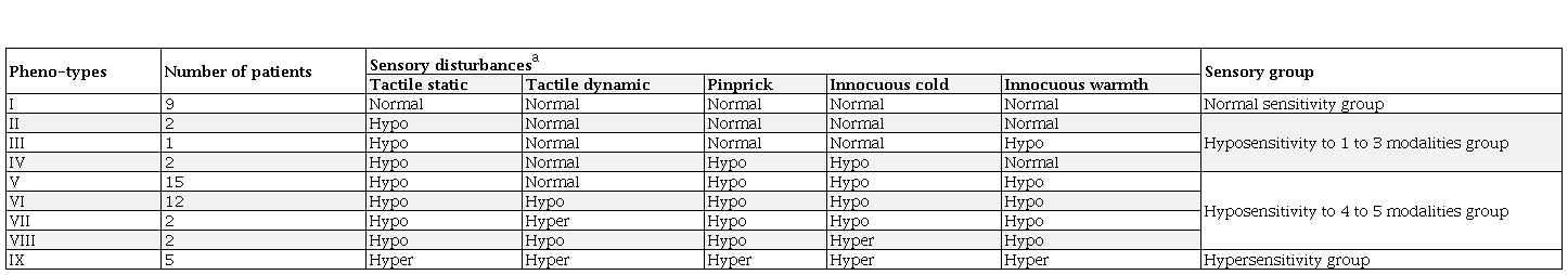 Grouping LSR patients by disturbances in each superficial sensory test revealed nine sensory phenotypes (Table 4).