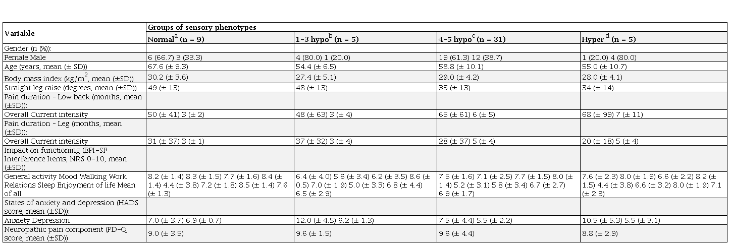 Conclusions. The applied multimodal bedside-suitable somatosensory testing battery is suitable for sensory evaluation and characterization of LSR patients. Grouping of allied sensory phenotypes revealed some tendencies in pain intensity characteristics.