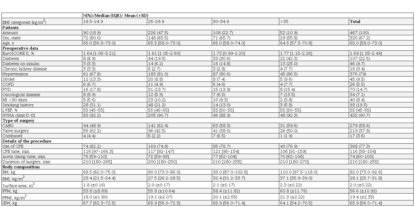 Study population. This was a retrospective study of patients who underwent elective cardiac surgery in a tertiary referral university hospital in a period of one year. Ethical approval was obtained from the Regional Research Ethics Committee and all patients provided written and informed consent to participate in the study. Inclusion criteria were as follows: primary elective cardiac surgery with median sternotomy, 18 years or older, cooperative and able to provide written informed consent. The following exclusion criteria were applied: patients with implanted defibrillators and major amputations. General preoperative characteristics were evaluated: age, sex, weight, body mass index (BMI), European System for Cardiac Operative Risk Evaluation (EuroSCORE) II, comorbidities and type of surgery. Details of procedure, such as usage and length of cardiopulmonary bypass (CPB), aorta clamp time and duration of surgery as well as preoperative and postoperative serum creatinine levels were collected. The patients were assigned into 4 BMI groups as follows: group 1 (BMI <25 kg/m.), group 2 (BMI 25–30 kg/m.), group 3 (30–35 kg/m.), group 4 (≥35 kg/m.) according to the WHO classification.