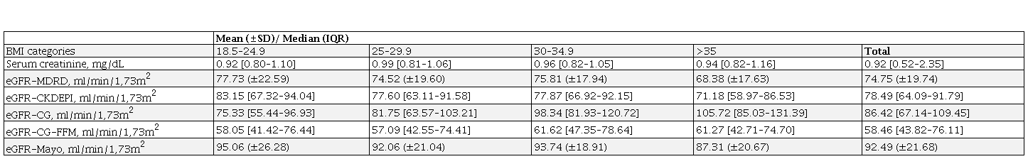 Results. Although all of the used equations showed similar predictive power in the normal weight and overweight category, Mayo formula had the highest AUC in predicting the occurrence of AKI (ROC-AUC 0.717 and 0.624, p<0.05). However, in the group of patients with class I obesity, only the CG formula modified with a fat-free mass appeared to be predictive of postoperative AKI (ROC-AUC 0.631 p<0.05). None of the equations were accurate in the group of BMI (>35 kg/m.).