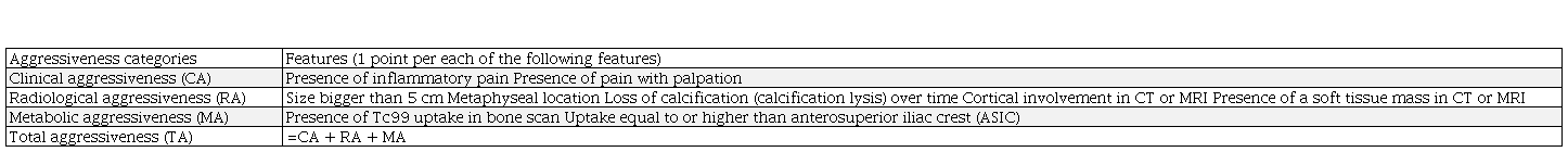Murphy et al. analysis names criteria that allows distinction of chondrosarcoma and enchondroma in at least 90% of cases. According to their study 100% of enchondromas and 94% of chondrosarcomas can be identified by mineralized matrix in CT. In addition, multiple clinical and imaging factors – particularly pain related to the lesion, depth of scalloping greater than two thirds of cortical thickness, cortical destruction, and soft-tissue mass (CT or MRI). Periosteal reaction (at radiography), and uptake greater than the anterior iliac crest at bone scintigraphy strongly suggest the diagnosis of chondrosarcoma [20]. In a newer clinical study Eugenio M. Ferrer-Santacreu et al. employed an aggressiveness score for doubtful cases to complement clinical and radiological data, but in no way it can be considered as an absolute indicator of malignancy. Total aggressiveness score was counted by adding 1 point for each following feature from 3 categories (Fig. 6). Their analysis established that those patients with a total aggressiveness score of 5 or more had a risk of having low grade chondrosarcoma higher than 50%. Authors also highlight the main clinical and radiological features to help differentiate between solitary enchondroma and low-grade chondrosarcoma [21]. Julia Crim et al. argue that both radiographs and MRI have limitations in the evaluation of low-grade cartilage lesions. MRI has an increased rate of both true-positive and false-positive diagnosis compared to radiographs [22]. We believe that due to the high risk of malignancy, constant monitoring with an experienced radiologist is important for early changes to be identified. Only after chondrosarcoma is suspected, specialized evaluation is required.