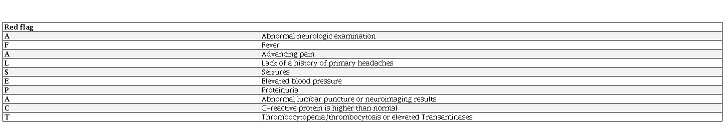 The occurrence of SHDs ranges from 14.3 to 52.6% of all pregnant women presenting with an acute headache [10,18,19]. Altogether, these studies suggest that hypertensive disorders, such as preeclampsia [18] and infections (most commonly viral infections and sinusitis) [4] are the most common causes of SHDs. It is important to emphasize that the hypercoagulable state caused by pregnancy [2,10] and migraine [20] are independent risk factors for preeclampsia, cerebral venous thrombosis, TIA and stroke [8,9]. Two retrospective studies reported that specific clinical findings, so-called “red flags” (Table 3) [4,18], should alarm doctors to investigate for the underlying cause of SHD.