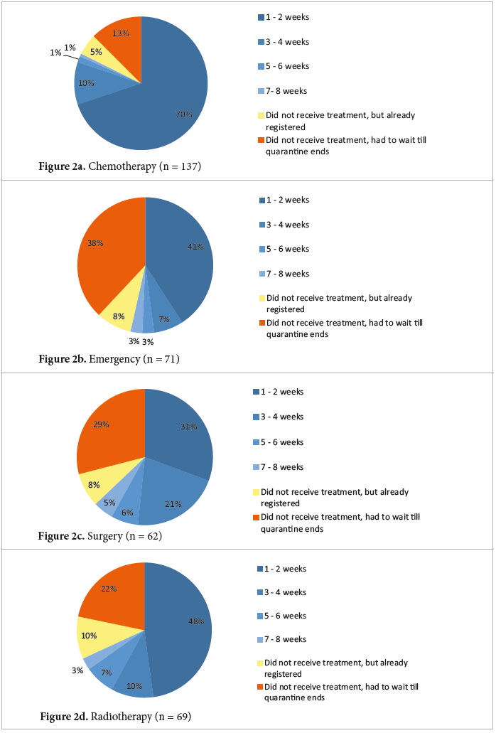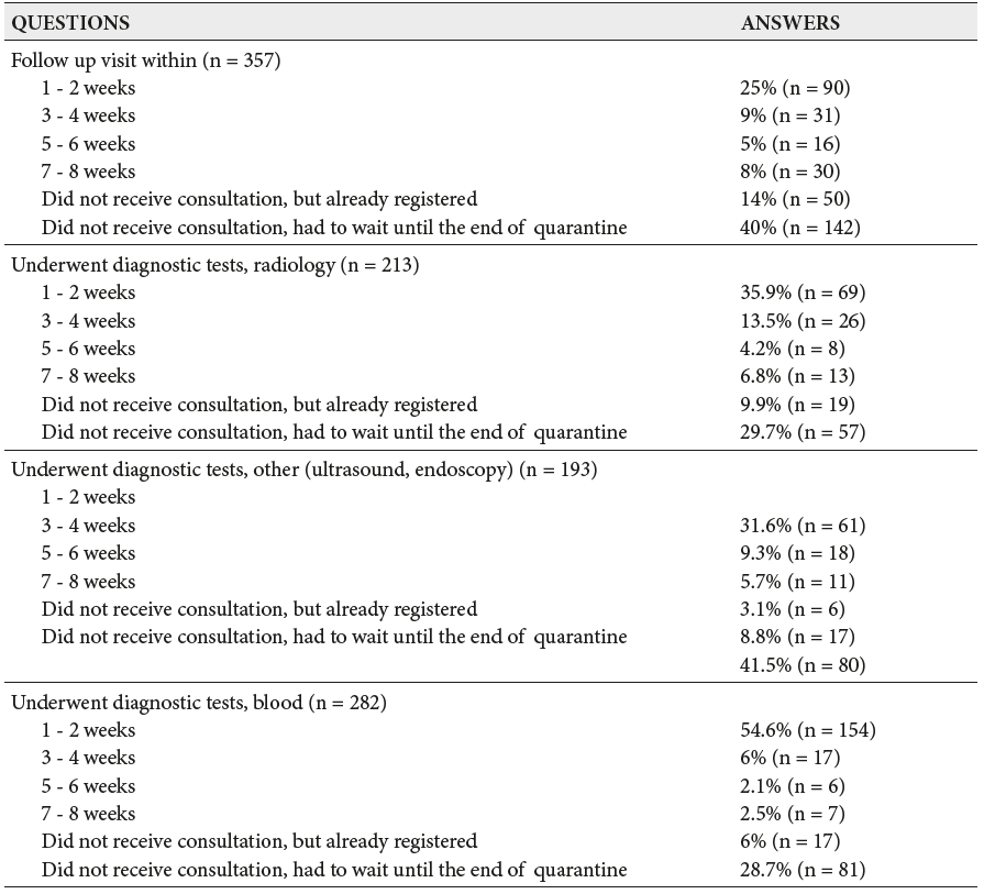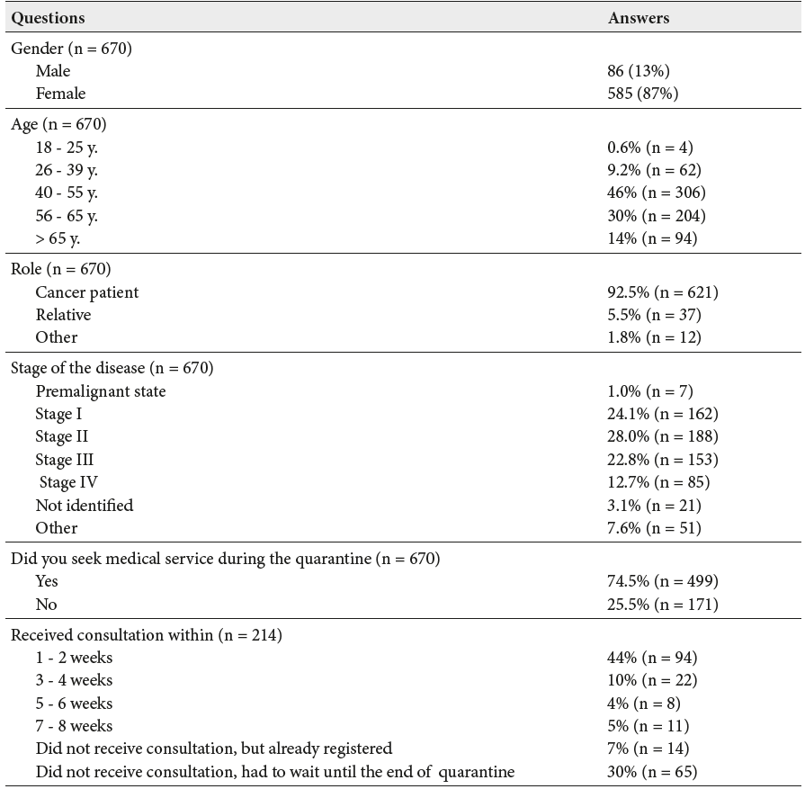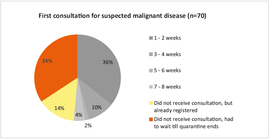 To find out how many patients did not receive necessary cancer care, Lithuanian Cancer Patient Coalition (lith. POLA – Pagalbos onkologiniams ligoniams asociacija) conducted a flash survey. This organization is the biggest umbrella patient organization in the country, uniting 31 nongovernmental organizations working in the cancer field and representing the interests of cancer patients, and aims to ensure that both patients and their families have access to effective treatment and the best possible informative, social, psychological and mental support. The POLA community flash survey on healthcare access during the COVID-19 pandemic was conducted from May 21st to June 1st. The survey was sent by an e-mail. In total, 670 people responded to the survey and 92.5% of them were cancer patients (Table 1). Almost three quarters of respondents sought medical care during the quarantine, and 34.3% of patients with suspected malignancy were told to wait for the first consultation until the end of quarantine (Figure 1).