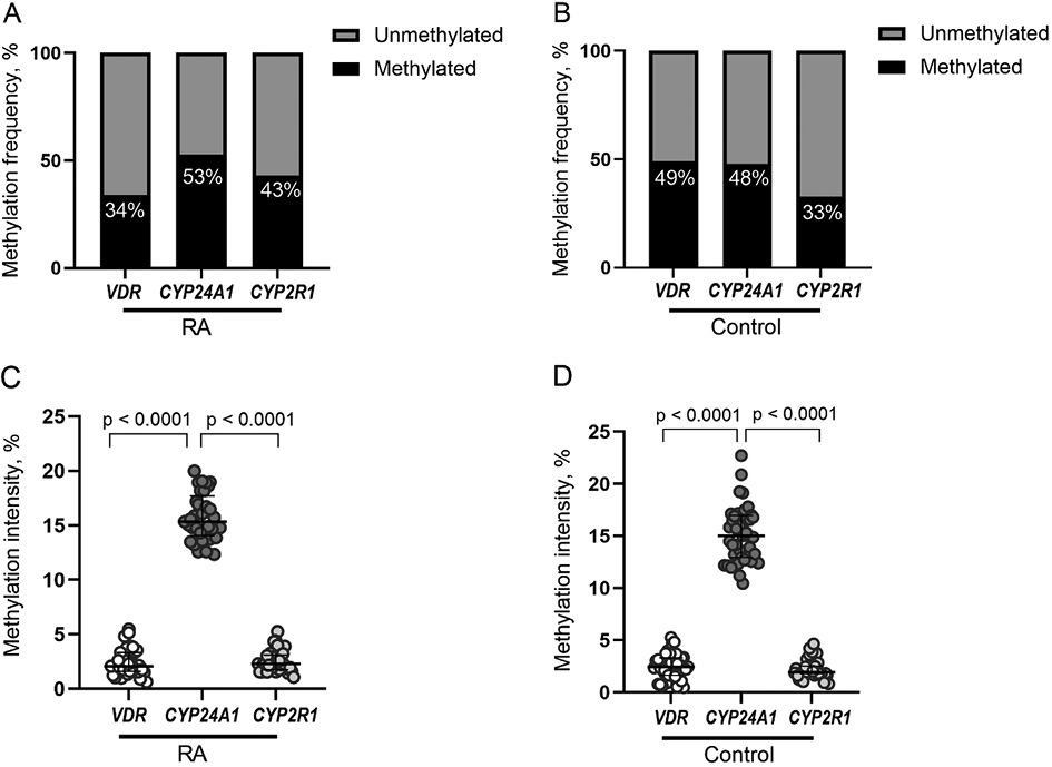 The mean methylation intensity of analyzed genes in RA vs. control group was as follows: VDR gene 2.39% vs. 2.48%, CYP24A1 gene 16.02% vs. 15.17% and CYP2R1 2.53% vs.2.41%. According to the average methylation intensity of each gene promoter regions, the threshold of methylation level was specified, and methylated vs. unmethylated samples detected to access the methylation frequency of all analyzed CpG positions (Figure 1A and 1B). Although the differences between the cases and controls were statistically insignificant (p>0.05), CYP24A1 methylation intensity was significantly higher compared to methylation intensity of VDR and CYP2R1 genes promoters in both groups (p<0.0001) (Figure 1C and 1D).