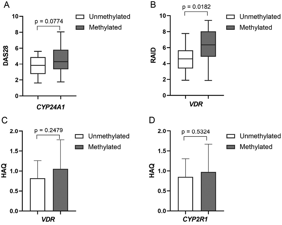 Materials and Methods: Totally 76 participants (35 RA patients and 41 healthy controls) were enrolled from a case-control vitamin D and VDR gene polymorphisms study regarding age and vitamin D concentration. CpG islands in promoter regions of the VDR, CYP24A1, CYP2R1 genes were chosen for DNA methylation analysis by means of pyrosequencing. Chemiluminescent microplate immunoassay was used to assess 25(OH)D serum levels. RA clinical data, i.e. the disease activity score C-reactive protein 28 (DAS28 – CRP) as well as patient-reported outcome questionnaires were recorded.