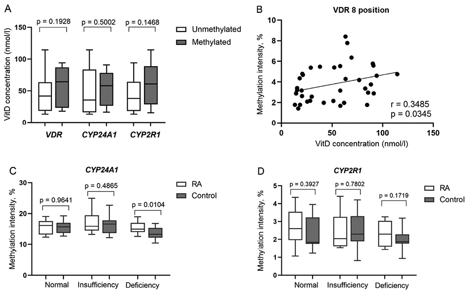 The study data showed higher vitamin D concentration in RA cases with methylated vs. unmethylated VDR (57.57±28.93 vs. 47.40±29.88 nmol/l), CYP24A1 (53.23±26.22 vs. 48.23±34.41 nmol/l) and CYP2R1(60.41±30.73 vs. 44.54±27.63 nmol/l) gene promoters, indicating that DNA methylation pattern of afore mentioned genes tend to be associated with higher vitamin D level. The differences were not statistically significant (Figure 4A), however, methylation intensity analysis of separate CpG positions revealed a significant positive correlation of VDR 8th position and vitamin D level (r=0.3485, p=0.0345) in RA (Figure 4B). Furthermore, methylation intensity of VDR and CYP2R1 genes promoters positively correlated with vitamin D concentration in RA patients, though not significantly (p>0.05). Vitamin D deficient (<50 nmol/l) RA subjects revealed a significantly higher CYP24A1 methylation intensity vs. vitamin D deficient controls (p=0.0104), thus indicating the disturbed vitamin D metabolism in RA (Figure 4C). Additionally, a higher CYP2R1 methylation intensity was also revealed in vitamin D deficient, as well as normal vitamin D level RA vs. control group, respectively, however not significant (Figure 4D). The methylation level of selected genes promoters did not differ significantly according to vitamin D status (normal range (≥75 nmol/l) vs. insufficiency (≥50–75 nmol/l) or deficiency (<50 nmol/l) and vice versa) in RA group. The use of vitamin D supplementation also did not show any statistically significant differences between the groups.