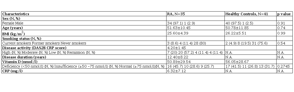 From a case-control vitamin D and VDR gene polymorphisms study [18] a group of 35 RA patients and 41 healthy controls was selected for further DNA methylation analysis of vitamin D metabolism pathway genes. Average age of RA subjects at enrolment into the study was 51.63±10.45 years, mean disease duration 12.40±8.22 years. For comparison analysis, age, sex and vitamin D matched healthy controls with mean age of 50.78±11.85 years were enrolled. In order to precisely assess epigenetic differences in both groups, measured serum concentration of 25(OH)D in RA patients did not differ significantly in comparison with controls (50.89±29.54 vs. 56.05±28.67, .>0.05). The detailed descriptive analysis of anthropometric, sociodemographic and clinical data of study participants is presented in Table 1.